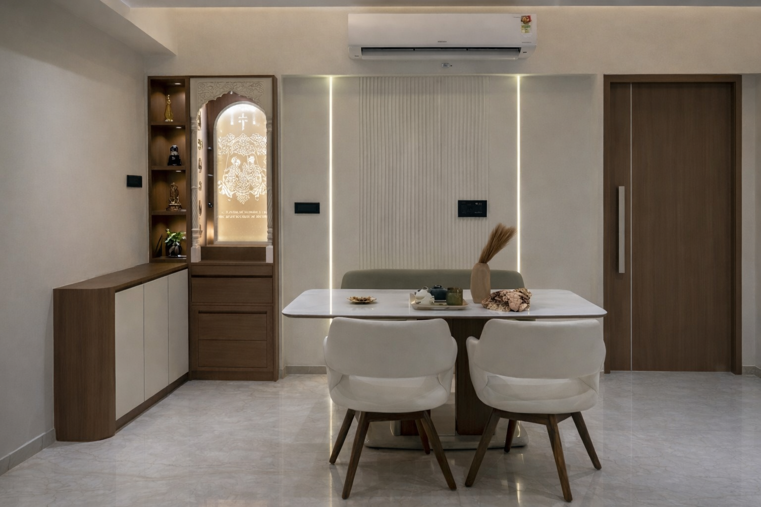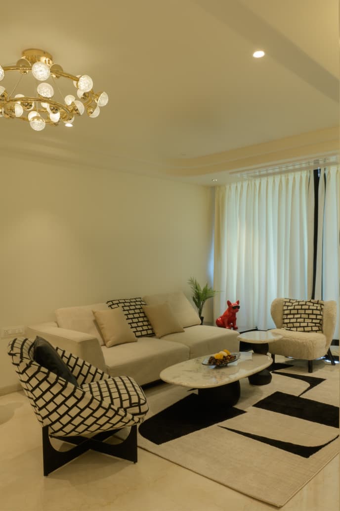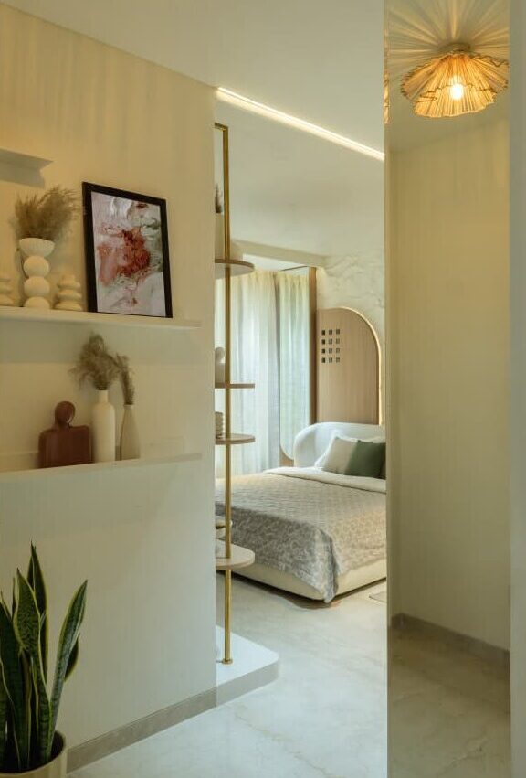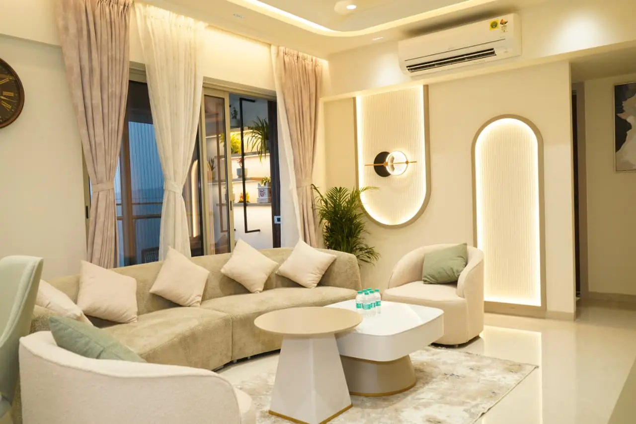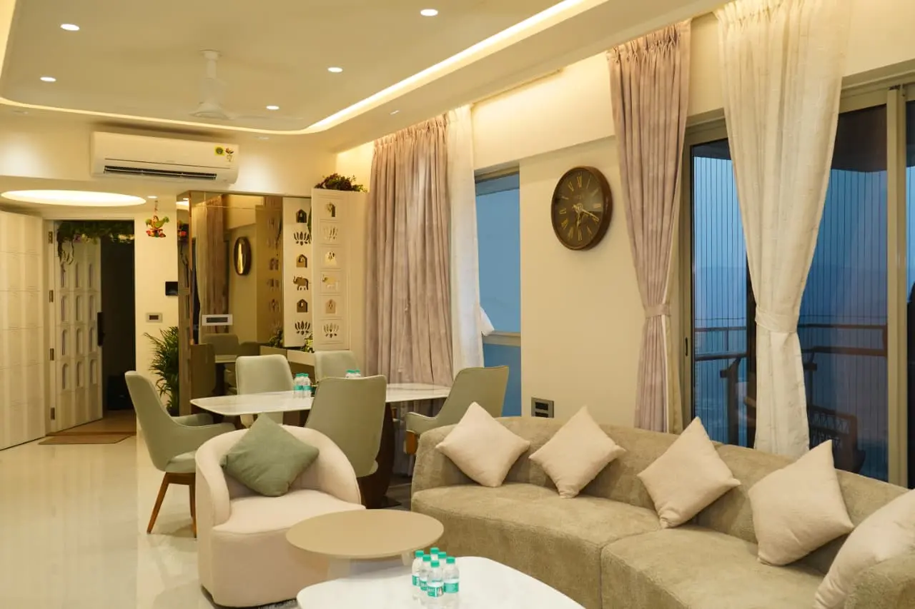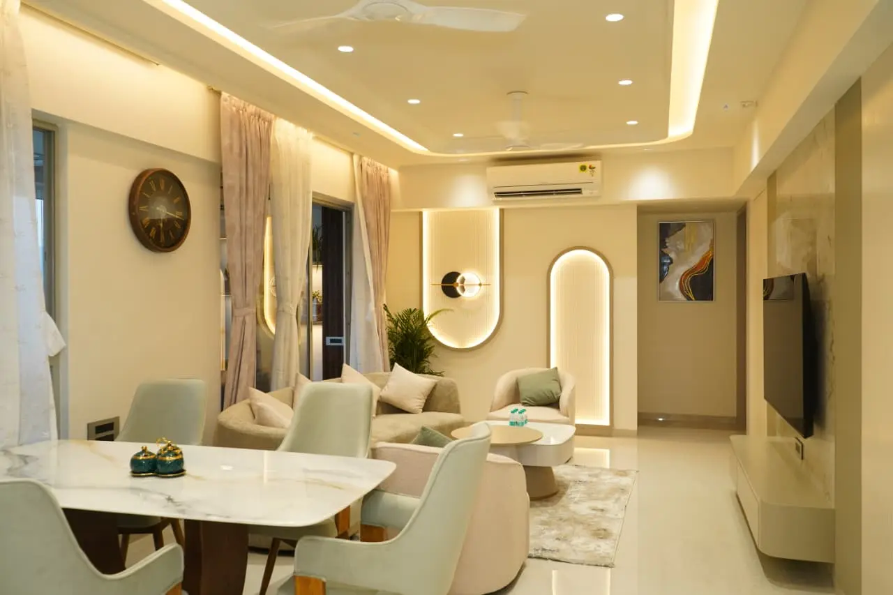 A thoughtfully designed luxury home featuring warm neutrals, layered lighting, and custom-crafted interiors by Morphic Interio.